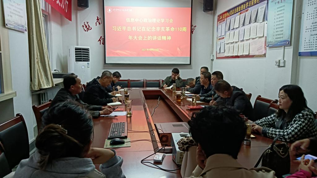 10月12日下午,信息中心召开理论学习会,学习习近平总书记在纪念辛亥革命110周年大会上的讲话,全体党员和教职工参加学习。 大家集体观看了《辛亥革命与中华民国的建立》、《纪念辛亥革命110周年大会在京隆重举行习近平发表重要讲话》视频资料。党支部书记安晓瑞领学了《习近平总书记在纪念辛亥革命110周年大会上的讲话精神》。 毛亮亮说习近平总书记在讲话中缅怀孙中山先生等革命先驱的历史功勋,深刻阐述了辛亥革命110年来的历史启示。赵勇说要学习他们为振兴中华而矢志不渝的崇高精神,更紧密地团结起来,携手向着中华民族伟大复兴的目标迈进。 党总支书记孙新民说习近平总书记在讲话中高度评价辛亥革命的历史功绩和重大意义,强调中国特色社会主义是实现中华民族伟大复兴的唯一正确道路,并再次强调中国完全统一的重要性和坚决遏制“台独”分裂活动的坚定意志,强调两岸同胞都要站在历史正确的一边,为祖国完全统一作出贡献,这对在世界各地的中华儿女都有重要的号召作用和启迪作用。