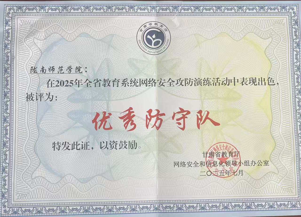 近日,2025年全省教育系统网络安全攻防演练结果揭晓,陇南师范学院信息化建设与服务中心凭借出色的综合防御能力与团队专业表现,被授予“优秀防守队”荣誉称号
