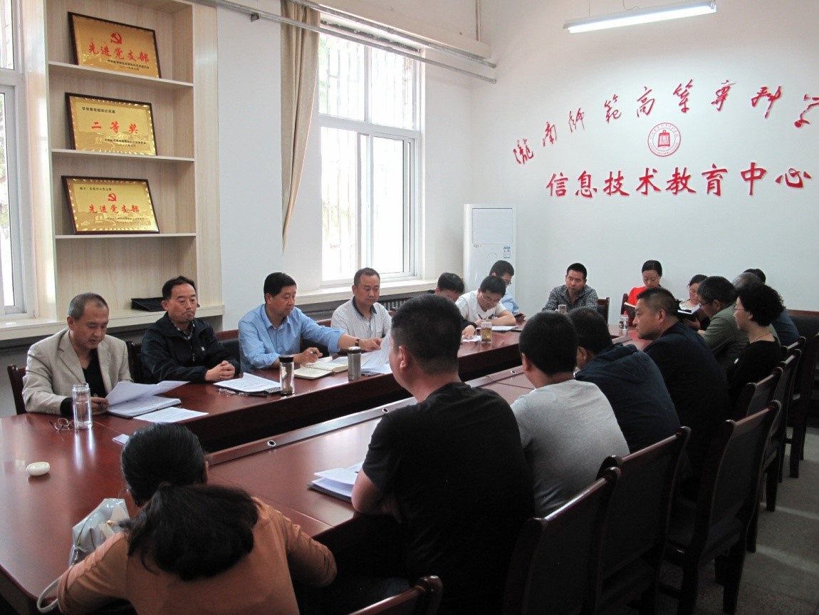 2018年5月22日下午,副校长任永峰、宣传部部长张益斌就学校信息化建设和网络信息安全工作到信息中心调研。 任永峰、张益斌在详细了解了学校信息化建设工作的进展和中心管理的计算机机房、多媒体教室、微格教室、录播教室、艺术实训中心设备运行情况、网络运行安全工作及目前存在的问题后,参加了信息中心全体教职工会议。